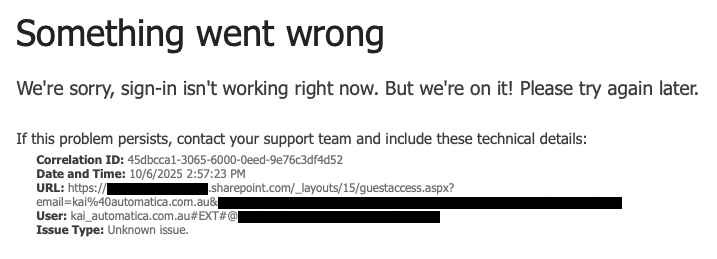 No matter what I did, I kept getting an error message whenever I tried to sign in as a guest to their tenancy: Something went wrong. We’re sorry, sign-in isn’t working right now. But we’re on it! Please try again later.
